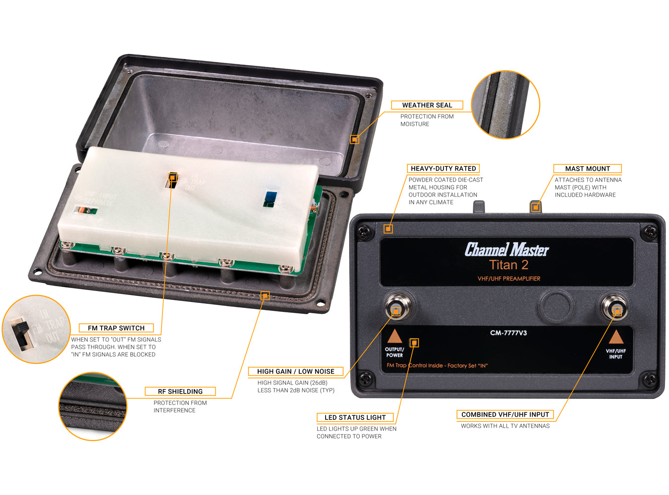 Titan 2 High Gain Preamplifier, Power Inserter, Power Adapter, Coaxial Cable, U-Bolt, User Guide